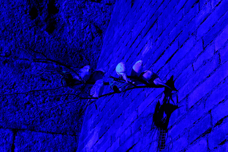I decided to invite an artist from Milan, Mattia Pajè, to create a work in this challenging space. He responded by creating an installation titled ‘Do you come here often?’ in which thirty parakeets lived in the bridge for the duration of the exhibition. Pajè described the installation as an “anomalous habitat” and compared the two arches of the bridge, which are dissected by a metal viewing platform, to the left and right sides of the brain. The parakeets were lit under UV lights, their different colour coats reflecting strangely, and as they flitted playfully from one arch to the other they seemed to represent the synaptic flashes of neural activity. Placed amongst the parakeets were a series of numbers, cut out in steel, which referenced the healing sequences theorised by the Russian pseudo-scientist Grigori Grabovoi. These sequences purportedly influence mental and psychological illnesses, generating the possibility of mental well-being in the viewer.”