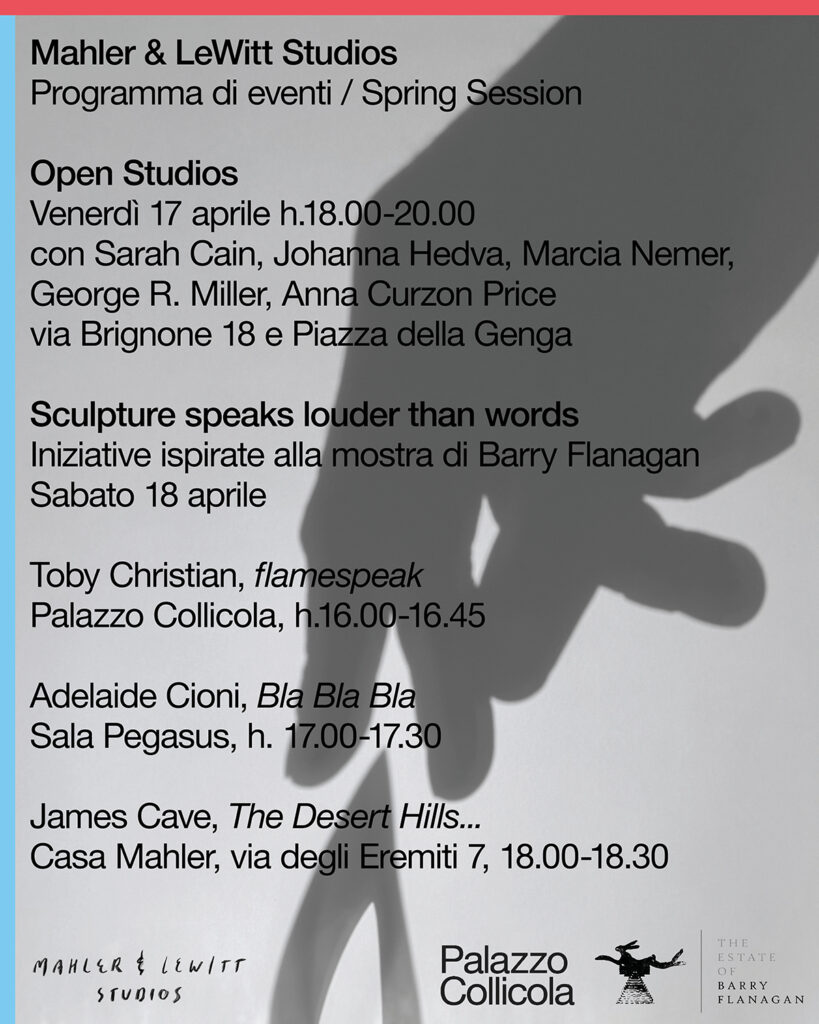 Siamo lieti di presentare un programma per le scuole e il pubblico in concomitanza con la mostra “Sculpture Speaks Louder Than Words – Barry Flanagan” a Palazzo Collicola, curata da Jo Melvin, ex residente dei Mahler & LeWitt Studios, e sostenuta dalla fondazione dell’artista.