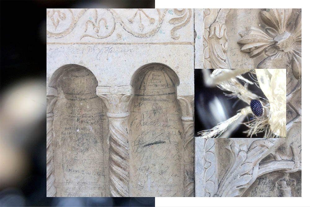 He found other subjects in Spoleto: felled mosquitos, rife in June, were collected from around the studios. Using a microscopic lens, attached to his cellphone, the insects were photographed and then printed onto connected panels of foamboard. The mosquitos, seen in excruciating detail, crumpled like crashed jets or fallen ballerinas, took on the poesy of momento mori.